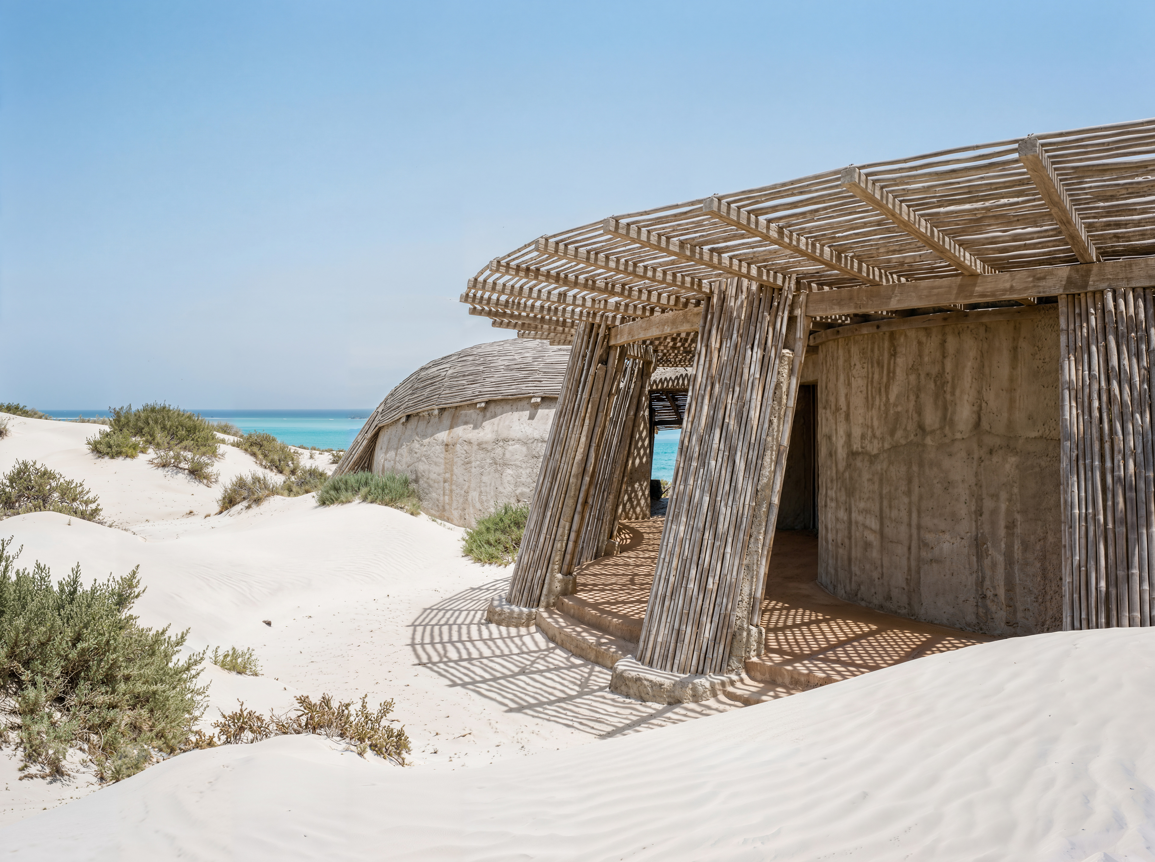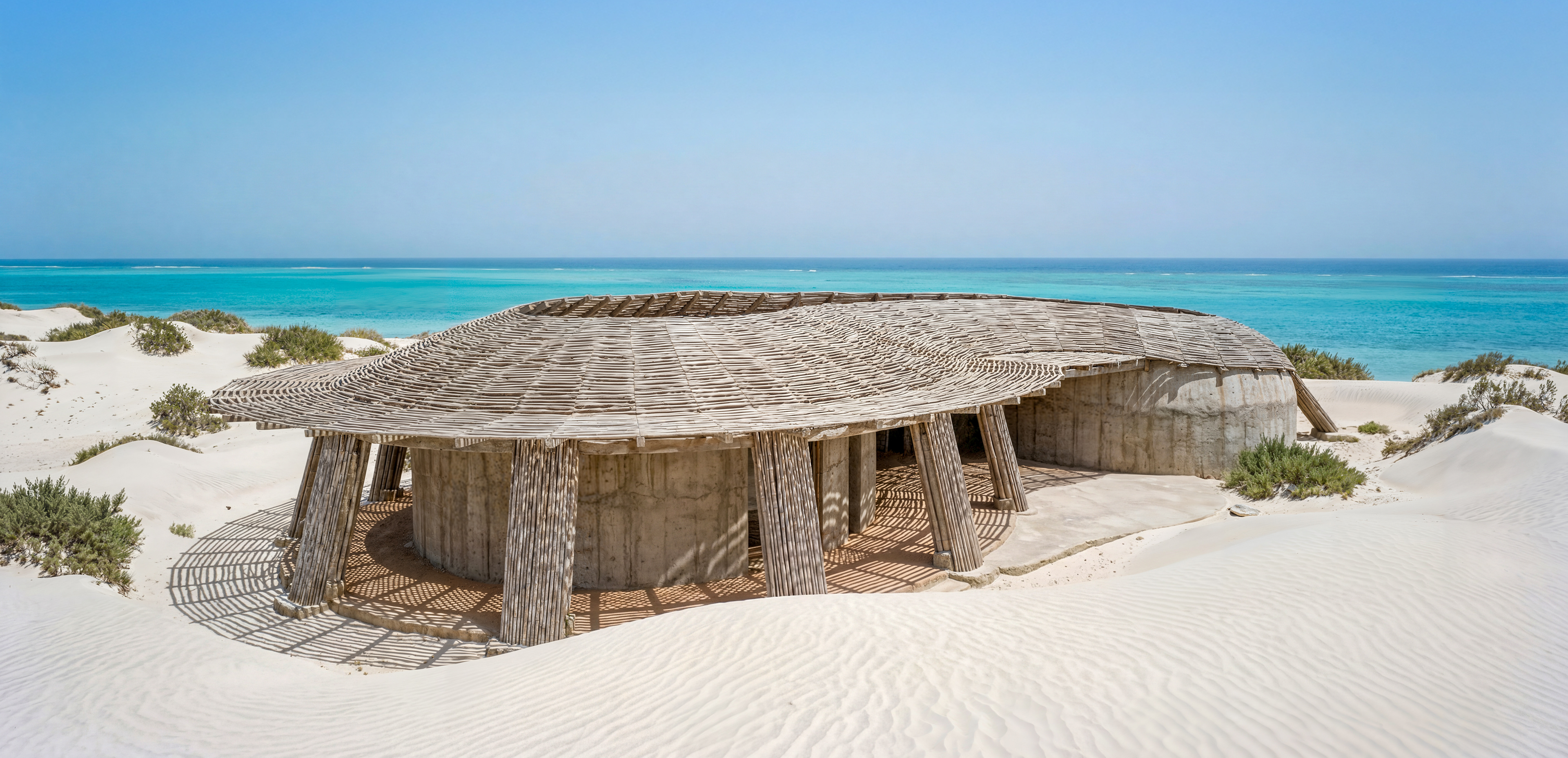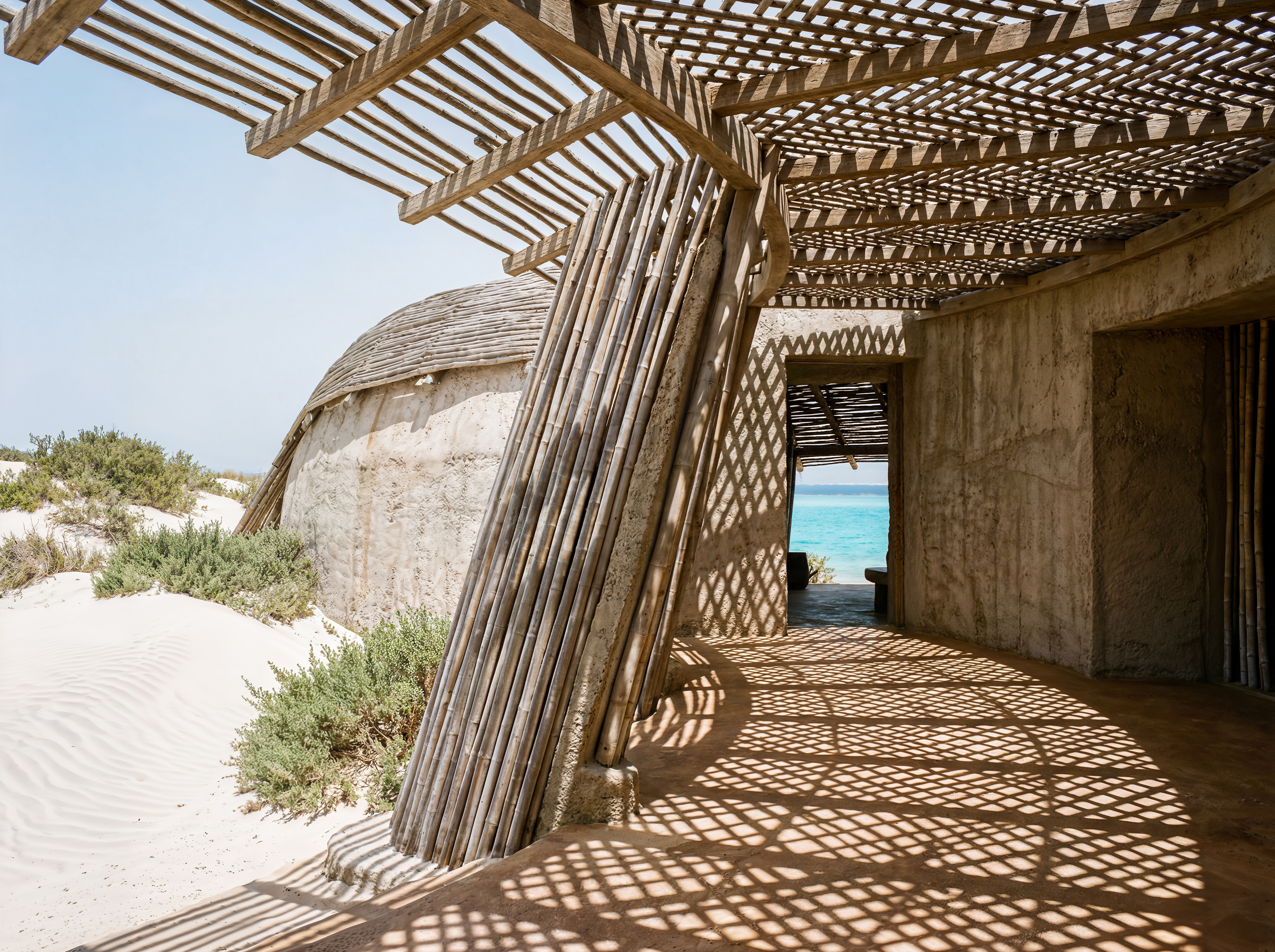 Designed as a sequence of sensory thresholds: from the blinding white sand to the cool, dark concrete interiors, finally opening up to the infinite turquoise horizon.