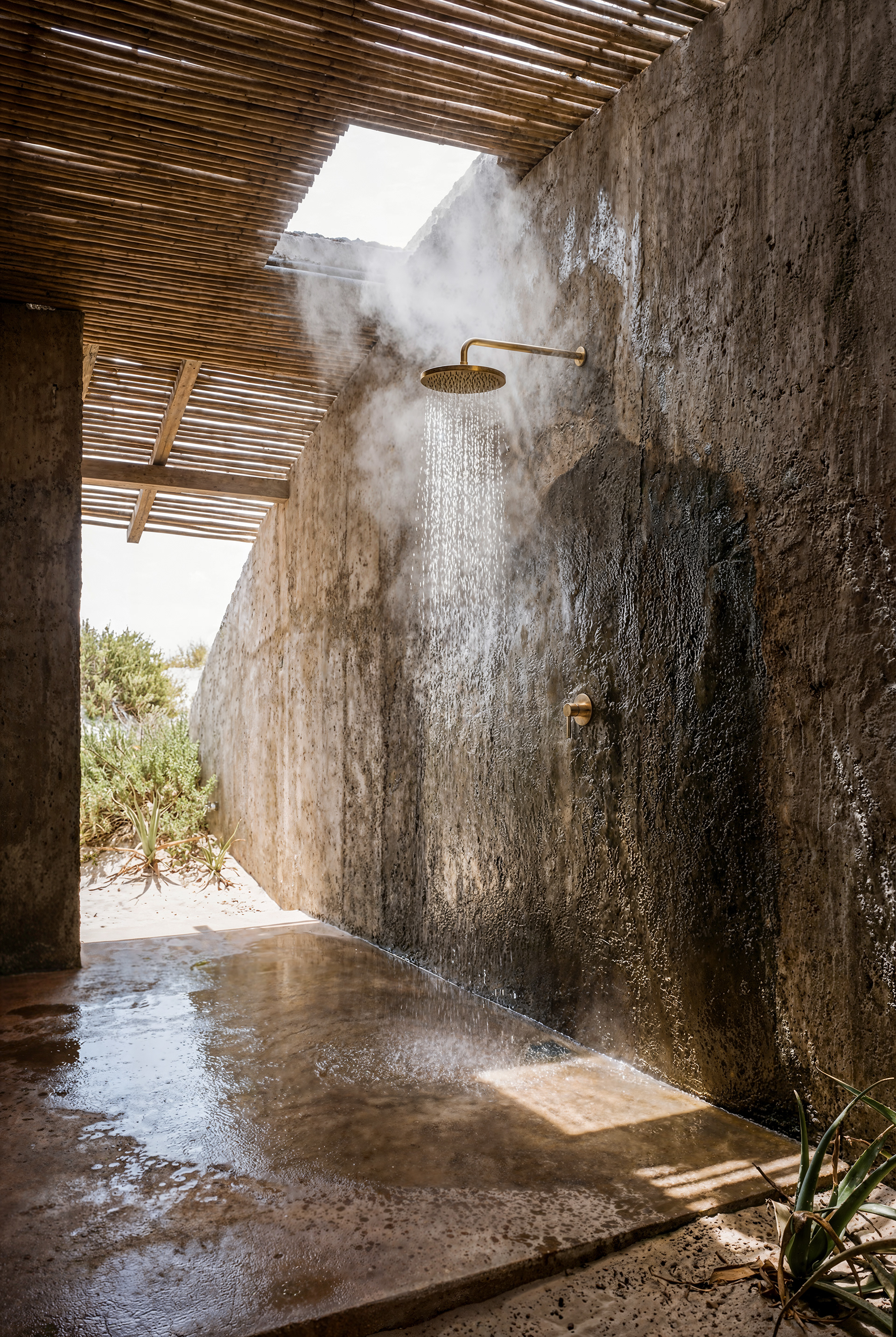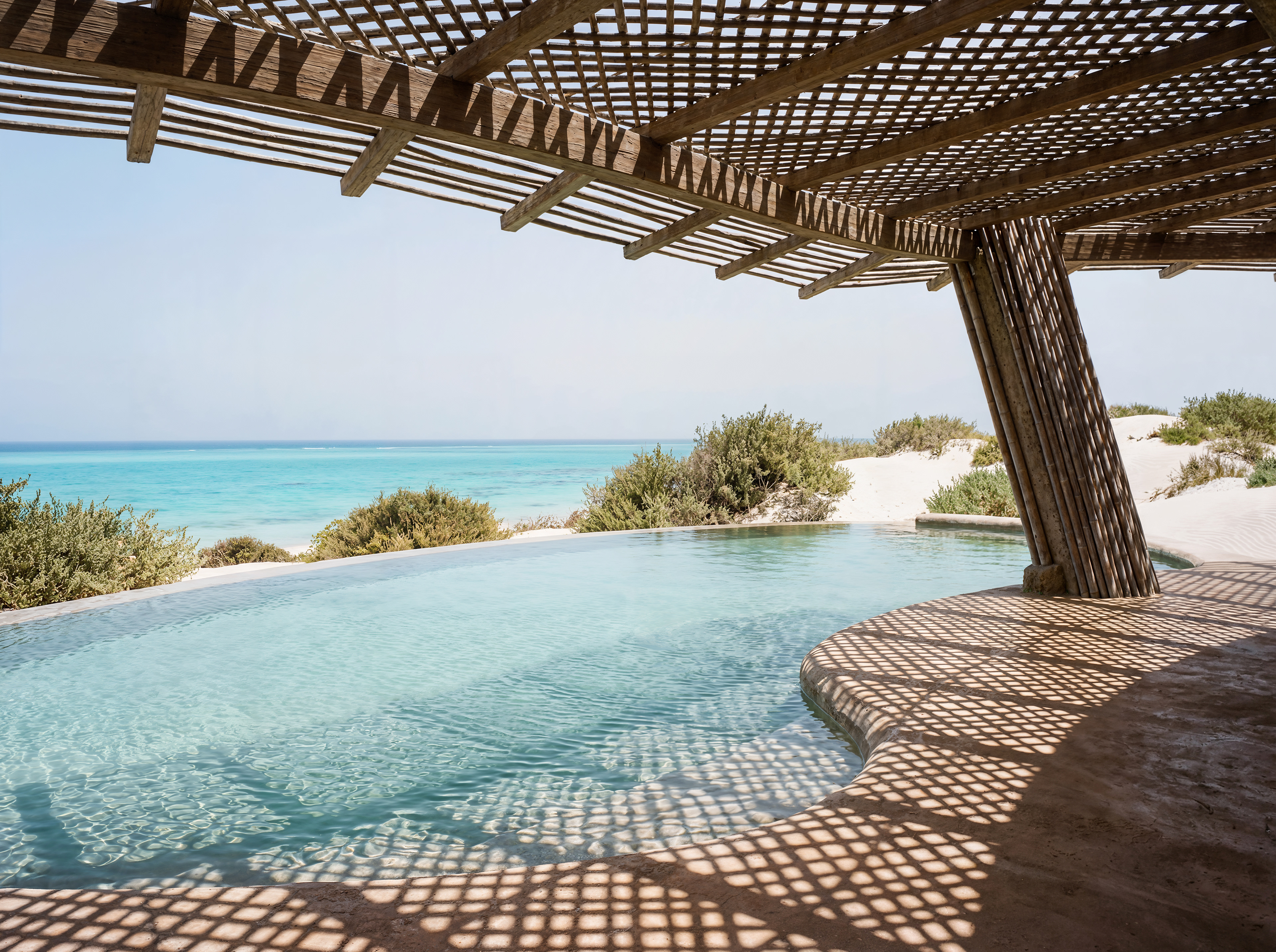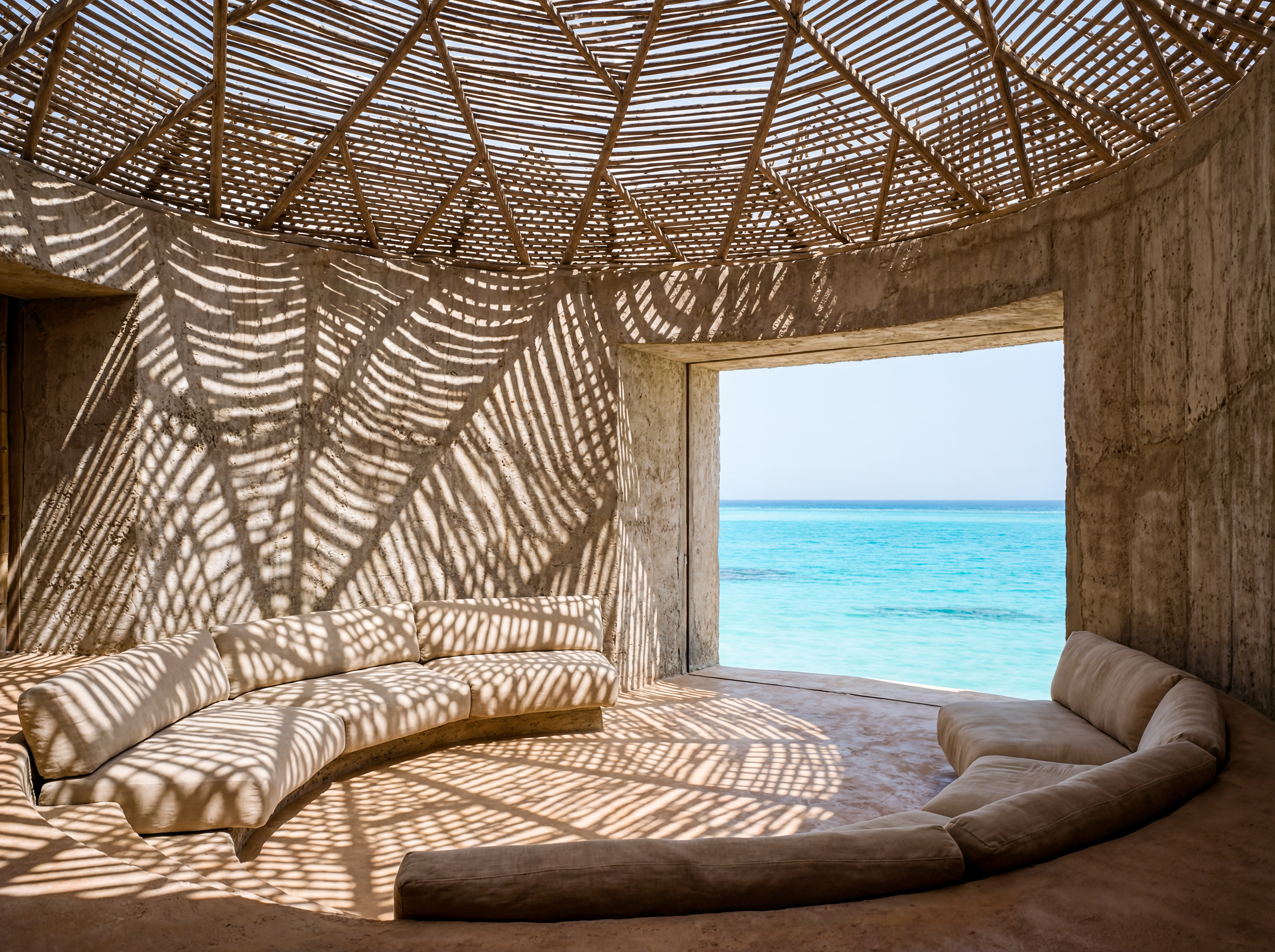 Designed as a sequence of sensory thresholds: from the blinding white sand to the cool, dark concrete interiors, finally opening up to the infinite turquoise horizon.