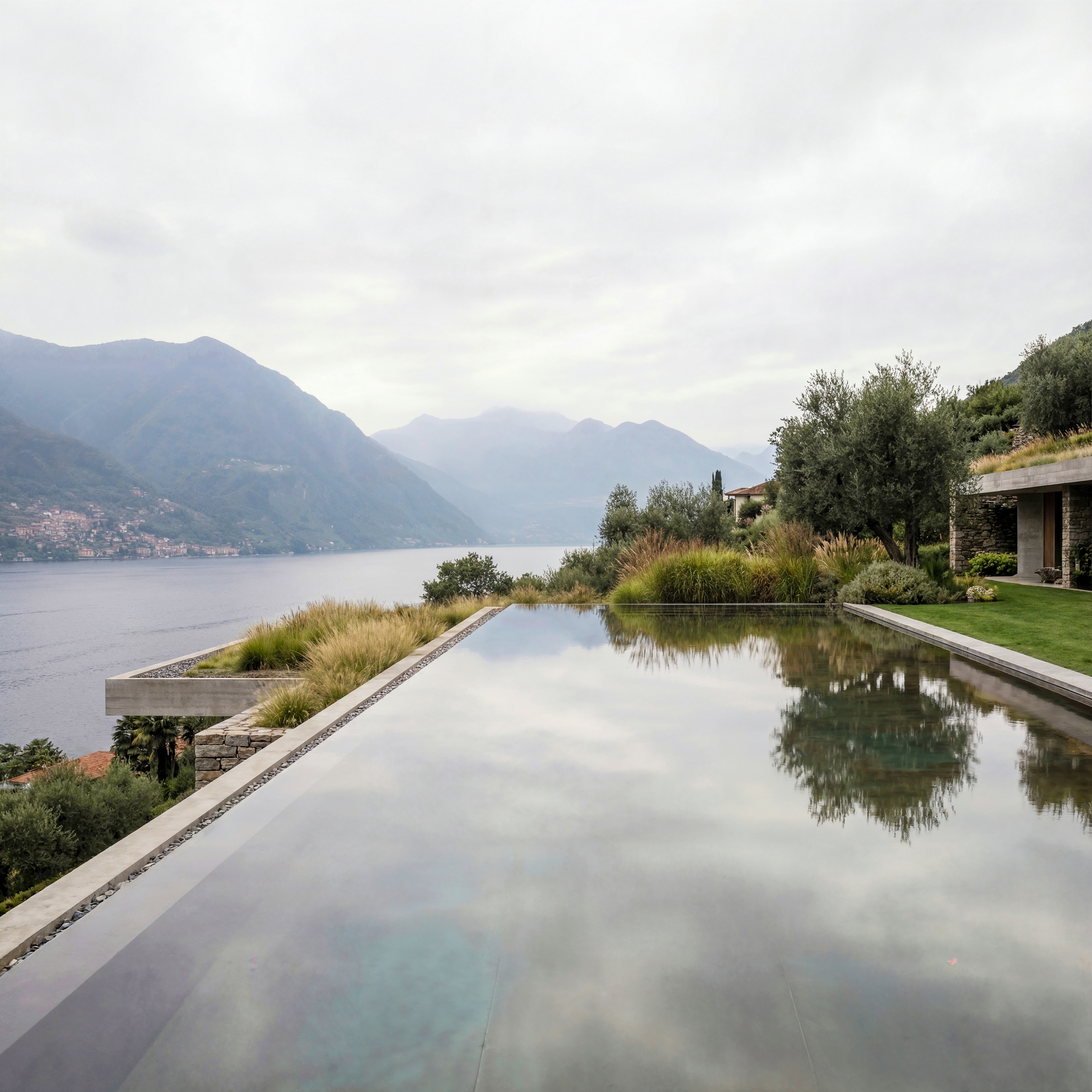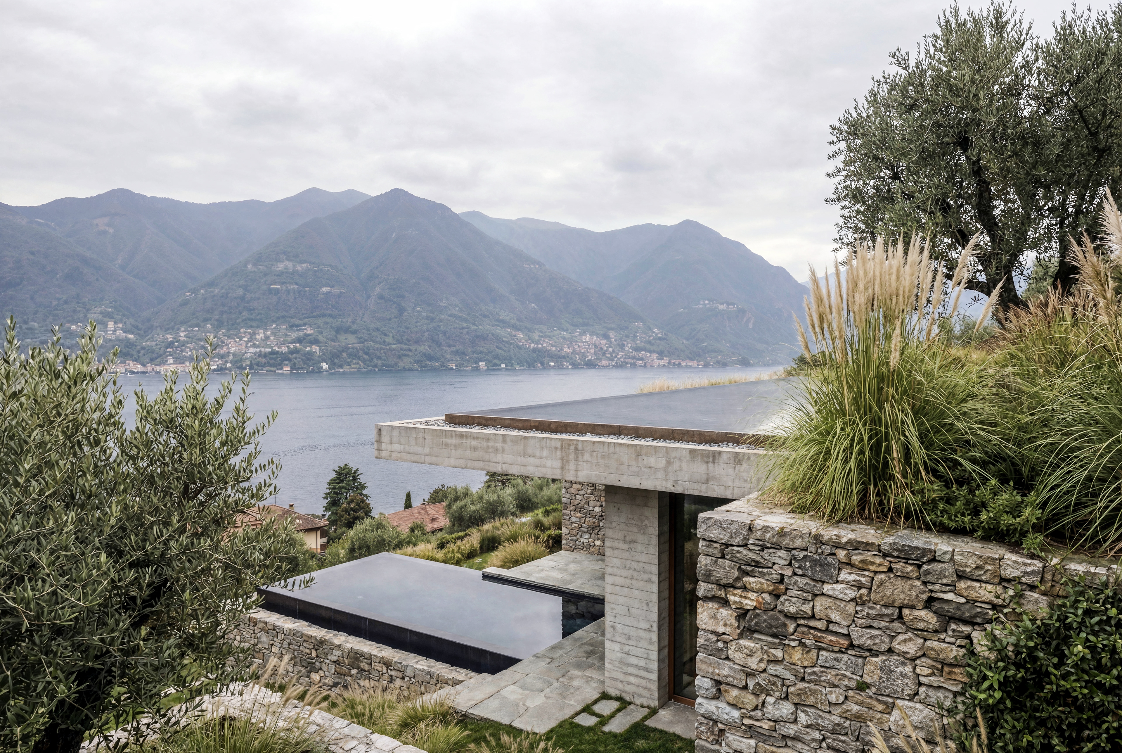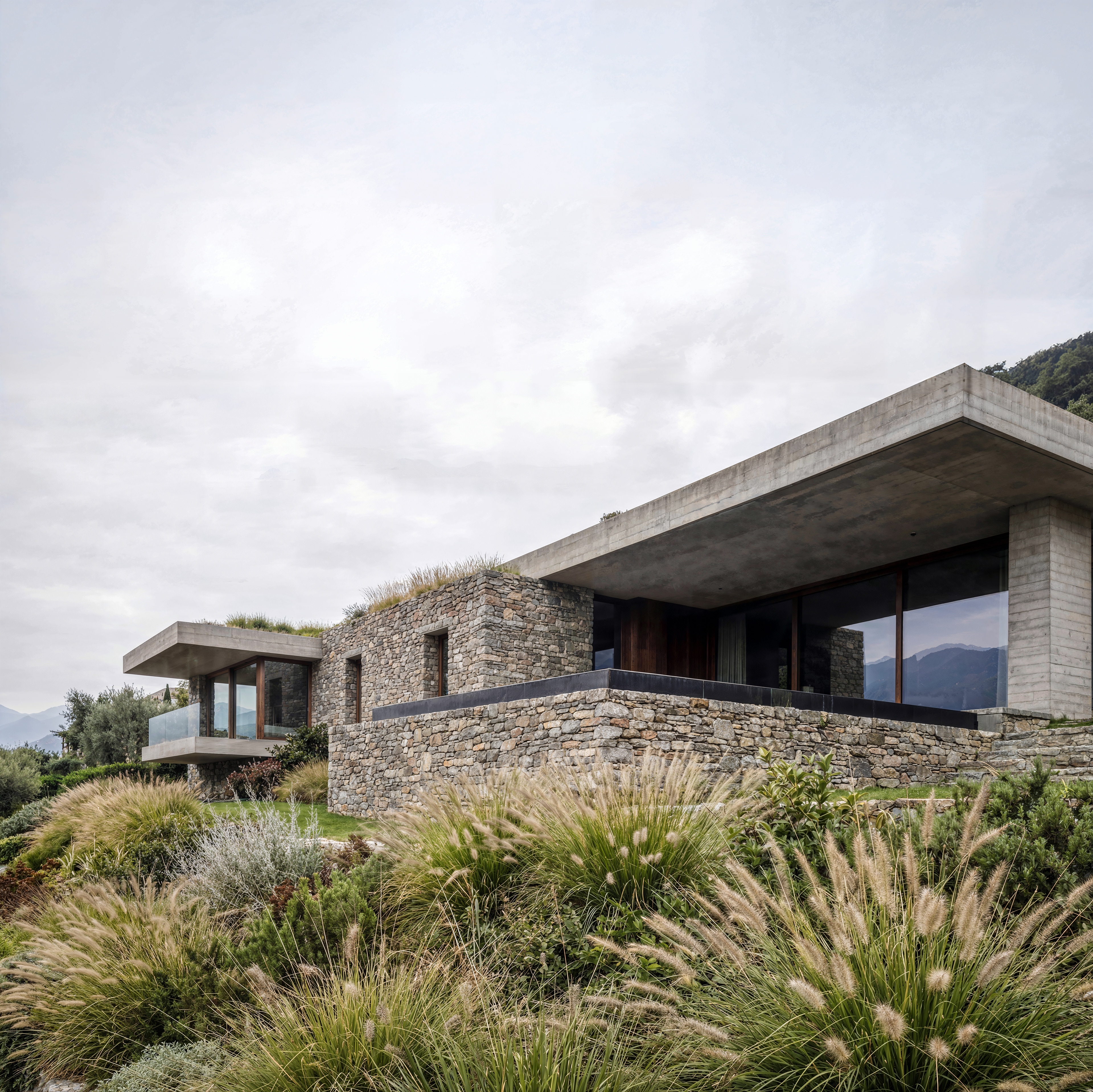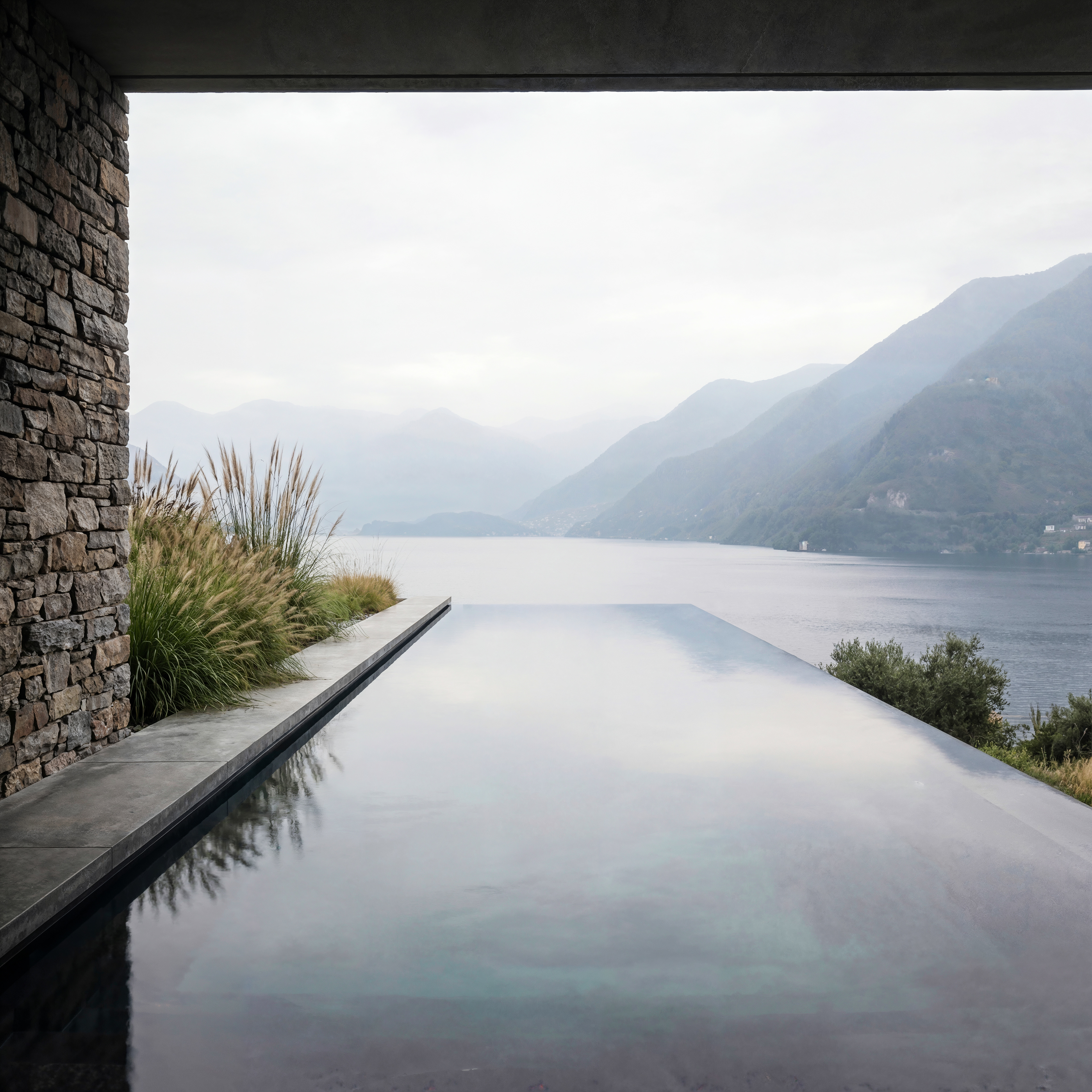 A quiet dialogue between raw concrete, local stone, and the atmospheric silence of the lake.