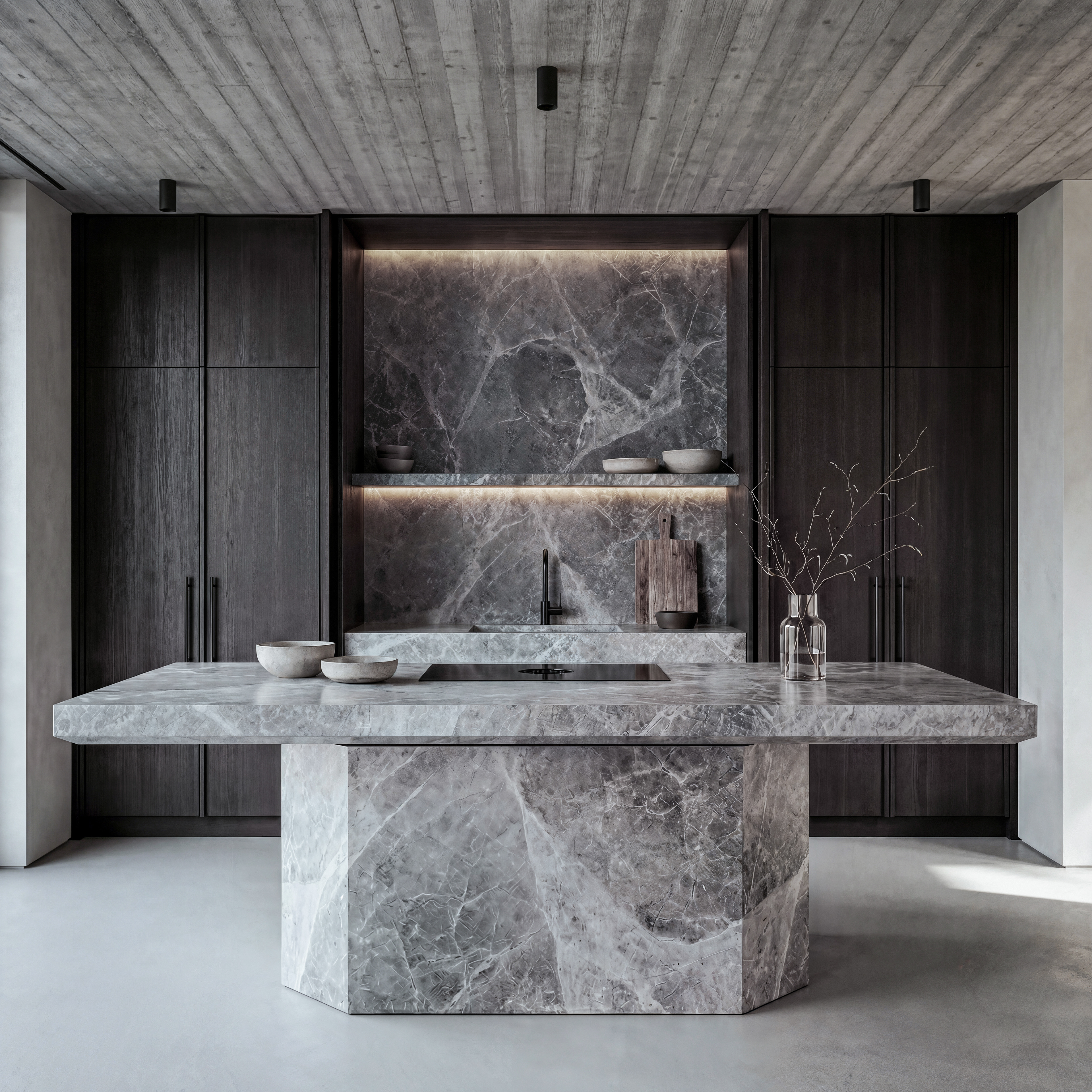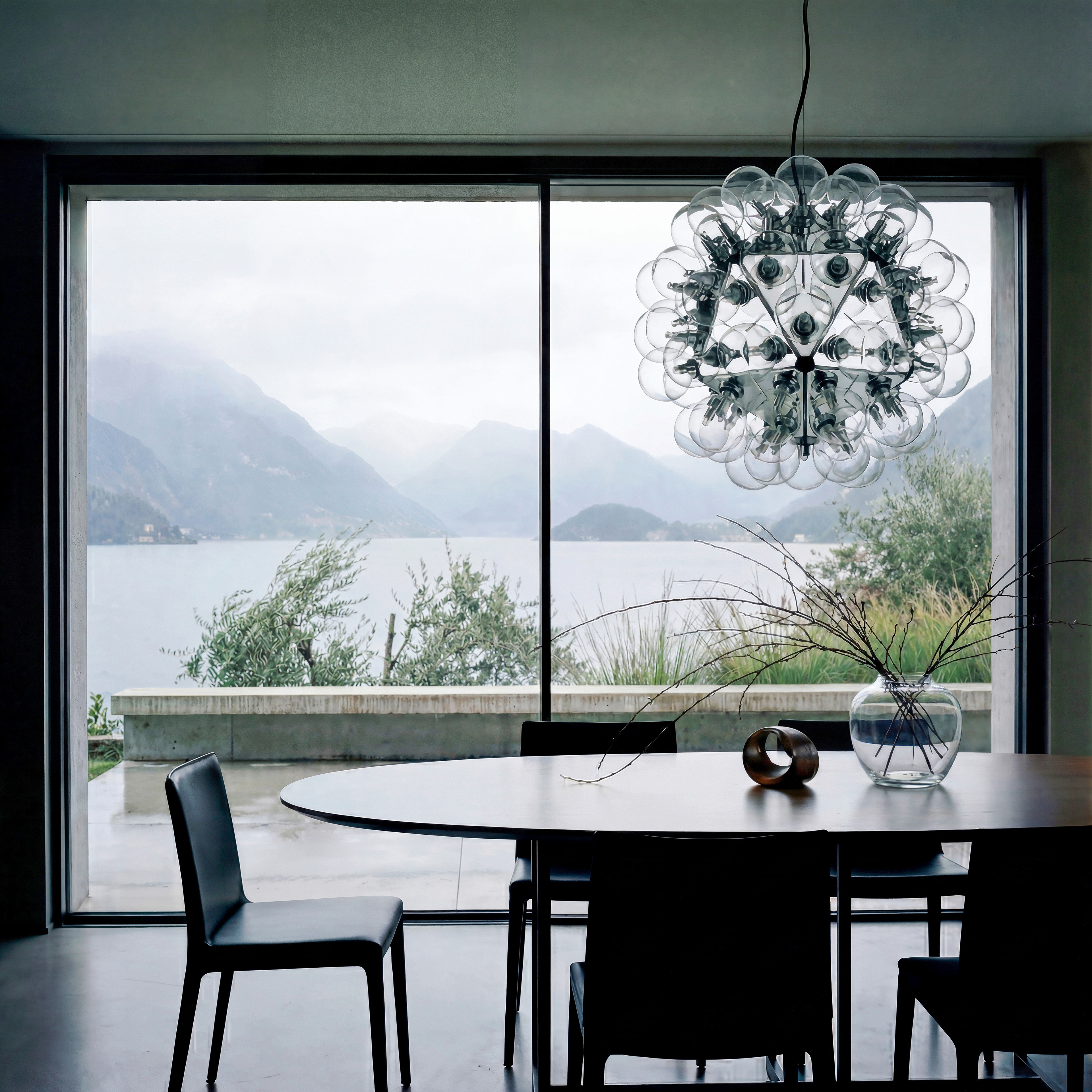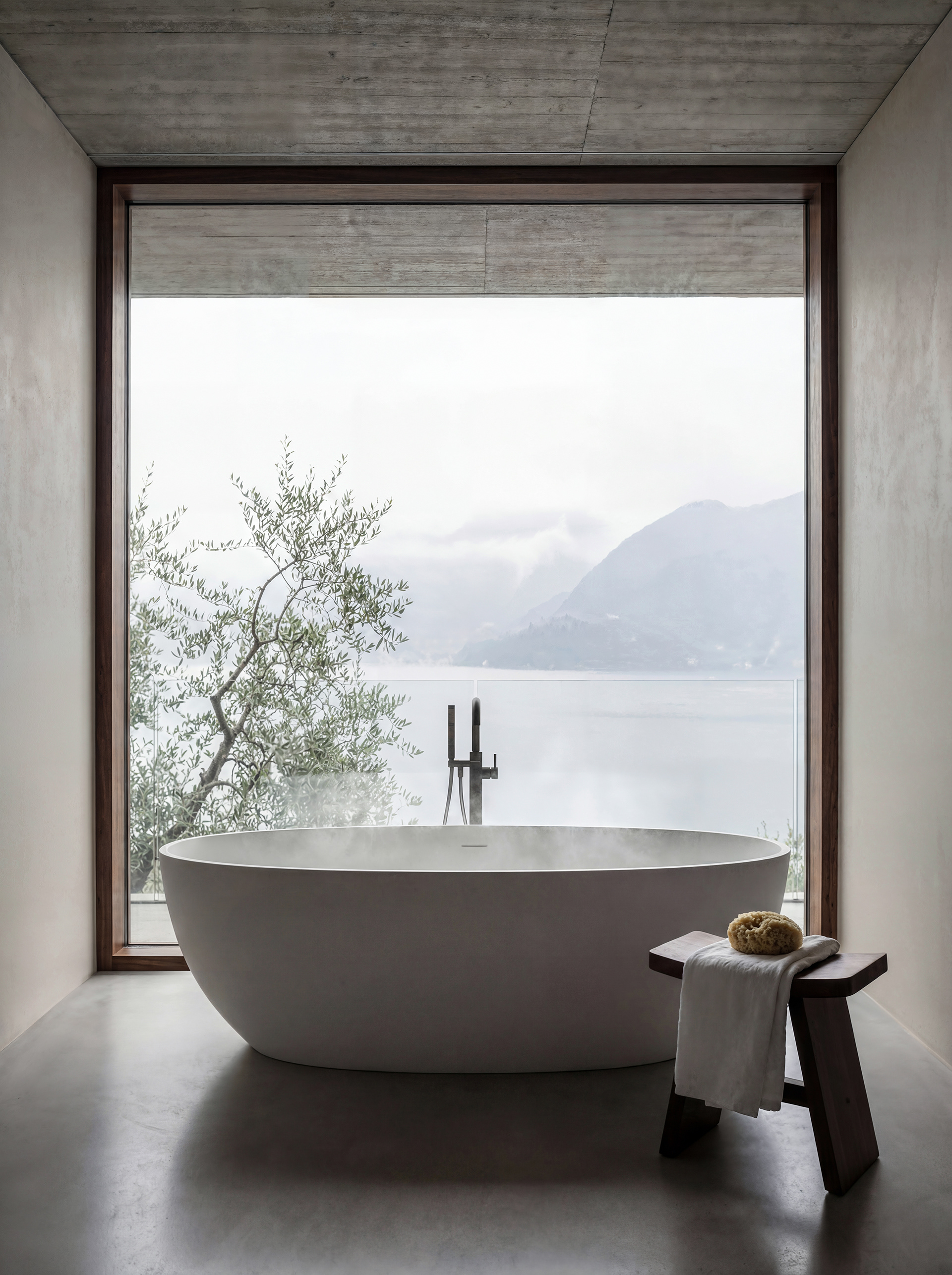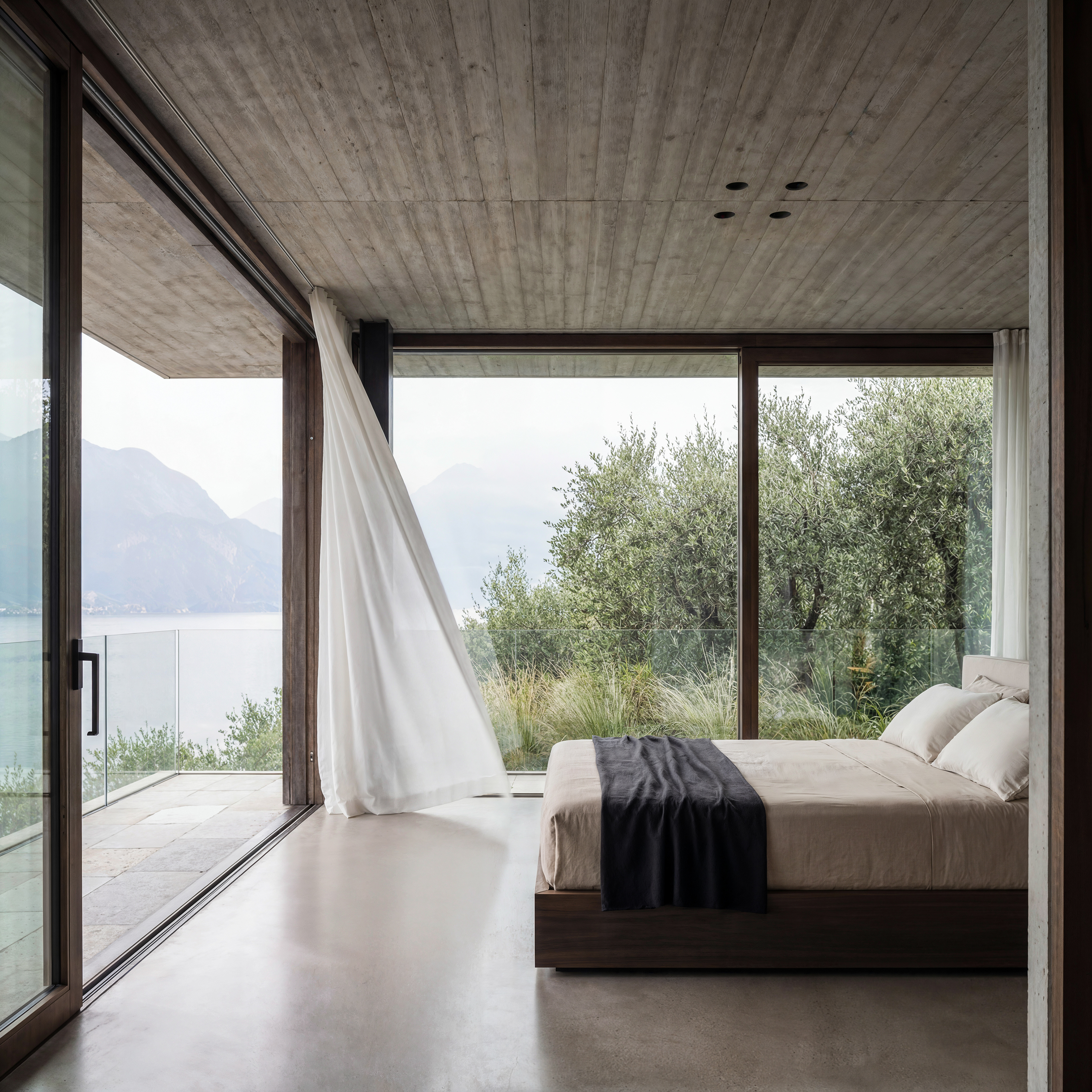 A quiet dialogue between raw concrete, local stone, and the atmospheric silence of the lake.